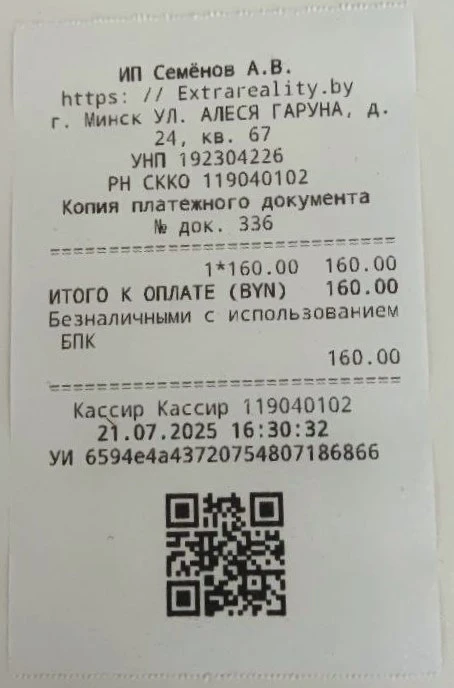 Клиент вправе отказаться от заказа в любой момент до его оплаты. В случае, если клиент хочет отказаться от заказа до его получения после оплаты на сайте, ему необходимо связаться с нами по телефону +375 29 9809190 или e-mail info@extrareality.by.